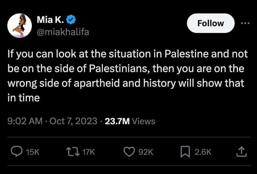 - Por lo menos Mia Khalifa, a quien despidieron de Playboy por su tuit en el que justificaba el actuar palestino el mismísimo 7 de octubre, es libanesa, y su familia cristiana tuvo que huir de los ataques israelíes y conoce de cerca la situación en Palestina. Pero ¿los que nunca han pisado Canaán? Por lo menos las hermanas Hadid son hijas de un palestino, Sacha Baron Cohen hijo de una israelí, y Natalie Portman y Gal Gadot nacieron en Israel; es entendible y quizá obligatorio que se pronuncien. Pero, ¿Justin Bieber? ¿Por qué tenía que compartir un story con la frase «praying for Israel», que encima estaba superpuesta sobre la imagen de un bombardeo en Gaza? 🤦. Opinamos sobre cualquier cosa sin informarnos bien, y esto tiene consecuencias.