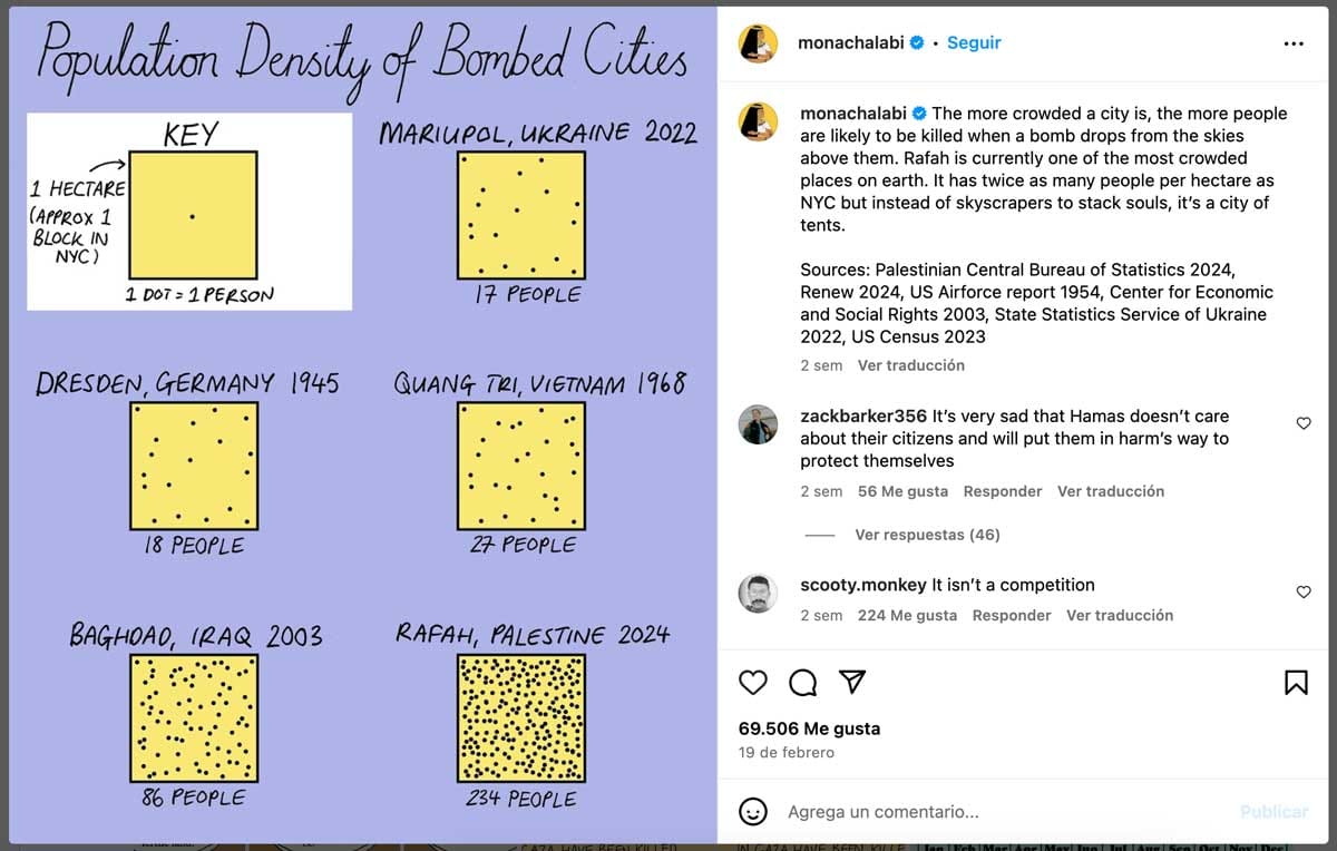 - 60% de la población (~1,4 millones de personas) está ahora mismo apiñada en la ciudad de Rafah, en campos de refugiados, esperando un bombardeo o ataque que parece inminente, justo en Ramadán, mes sagrado. La periodista e ilustradora Mona Chalabi dice que estamos hablando del doble de gente por hectárea que en Nueva York... pero con carpas en vez de rascacielos.