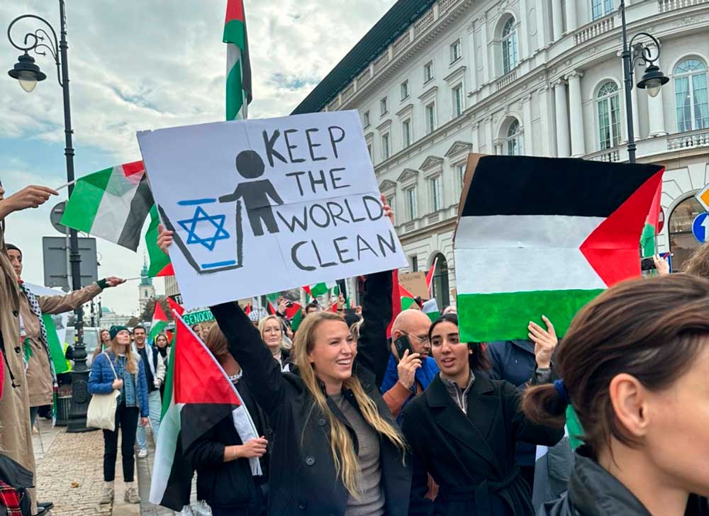 - Como en las últimas operaciones de represalia israelíes, se había visto protestas alrededor del mundo en favor de la causa palestina; pero esta vez han sido multitudinarias en todas partes, en todas las capitales de Occidente y hasta en pueblitos que uno pensaría que no tienen nada que ver con la política mundial. En los inicios de la guerra empecé a anotar y contar todos los lugares para incluirlos aquí, pero son tantos que no tiene sentido hacer una lista. Ha habido marchas pro ambos bandos, pero las del «bando» palestino han sido abrumadoramente mayores. Más grandes, más bulliciosas, más violentas. En estas marchas se ha gritado y pedido de todo excepto paz.