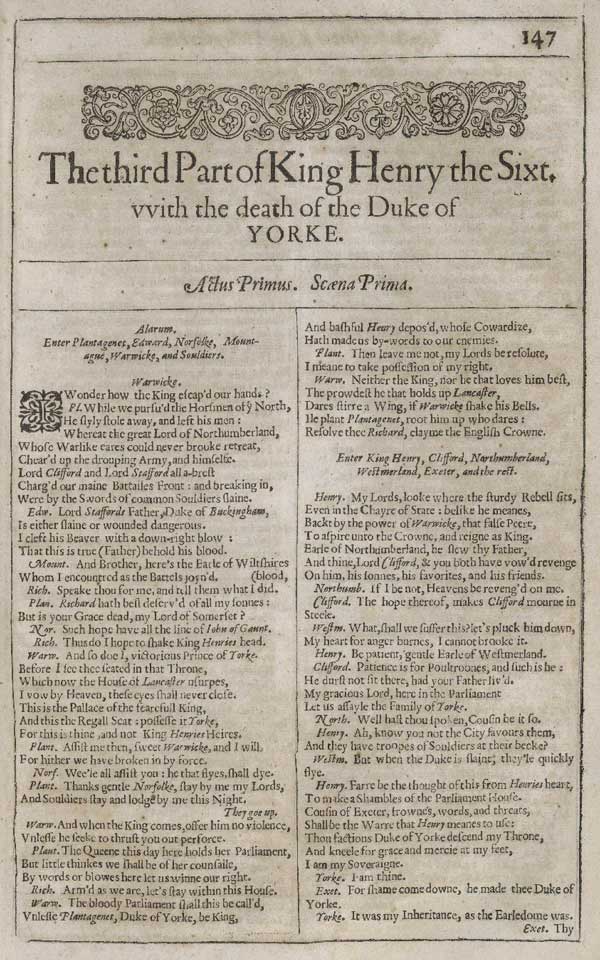 La reina Isabel I marcó una era: reinó 44 años (26 menos que la segunda, que falleció hace poco). Era hija de Ana Bolena y Enrique VIII, que era hijo de Enrique VII —el primero de los Tudor—, que no era hijo de Enrique VI, sino nieto de la viuda de Enrique V. No es el día para hablar de esto, aunque tenga que ver con la escena que leemos a continuación: la cuarta escena, del primer acto, de la tercera parte de Enrique VI, de William Shakespeare — oficialmente: The third Part of Henry the Sixt, vvith the death of the Duke of Yorke, una muerte que leemos aquí (así se escribía antes «sixth» y «with»).